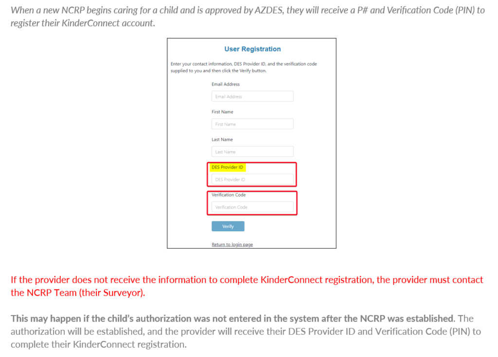 Step 2: After 1/23/24, NCRP will receive a Provider ID and Verification Code (PIN) to register their account in KinderConnect. The new Sponsor will register with KinderSmart or KinderSign.